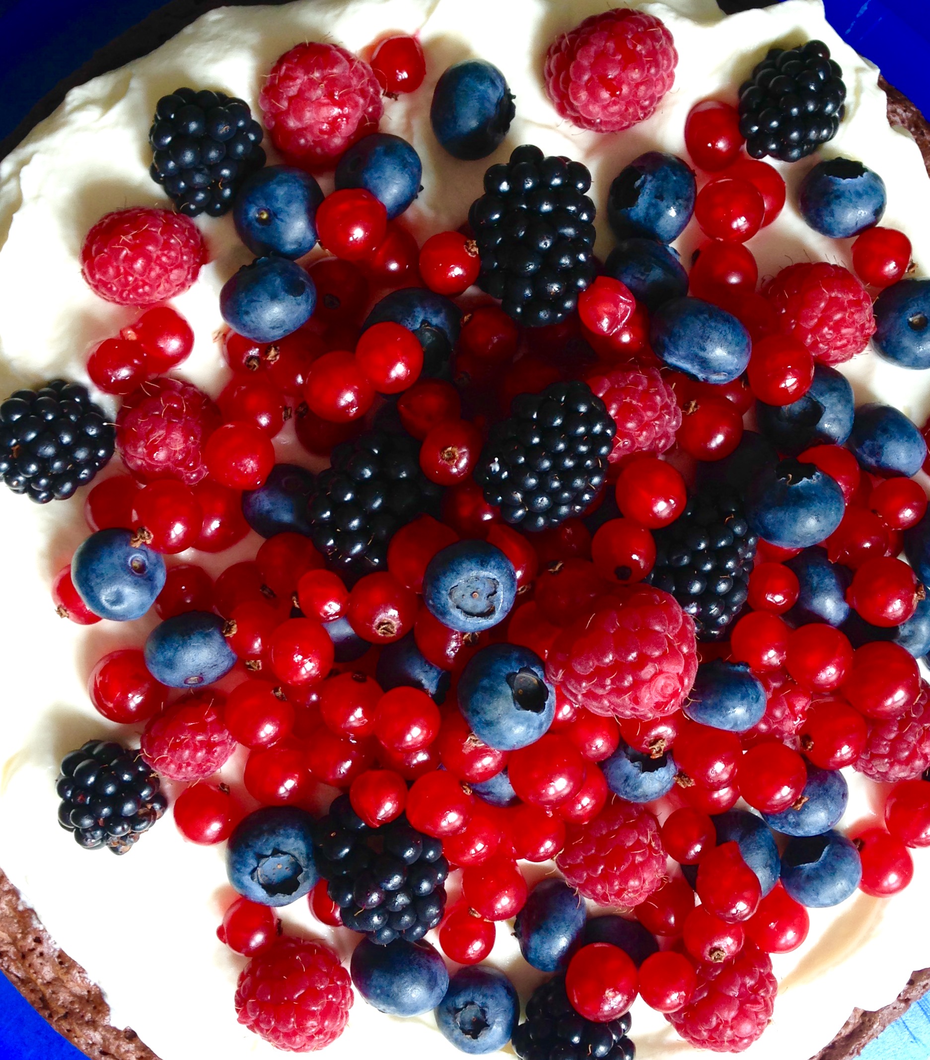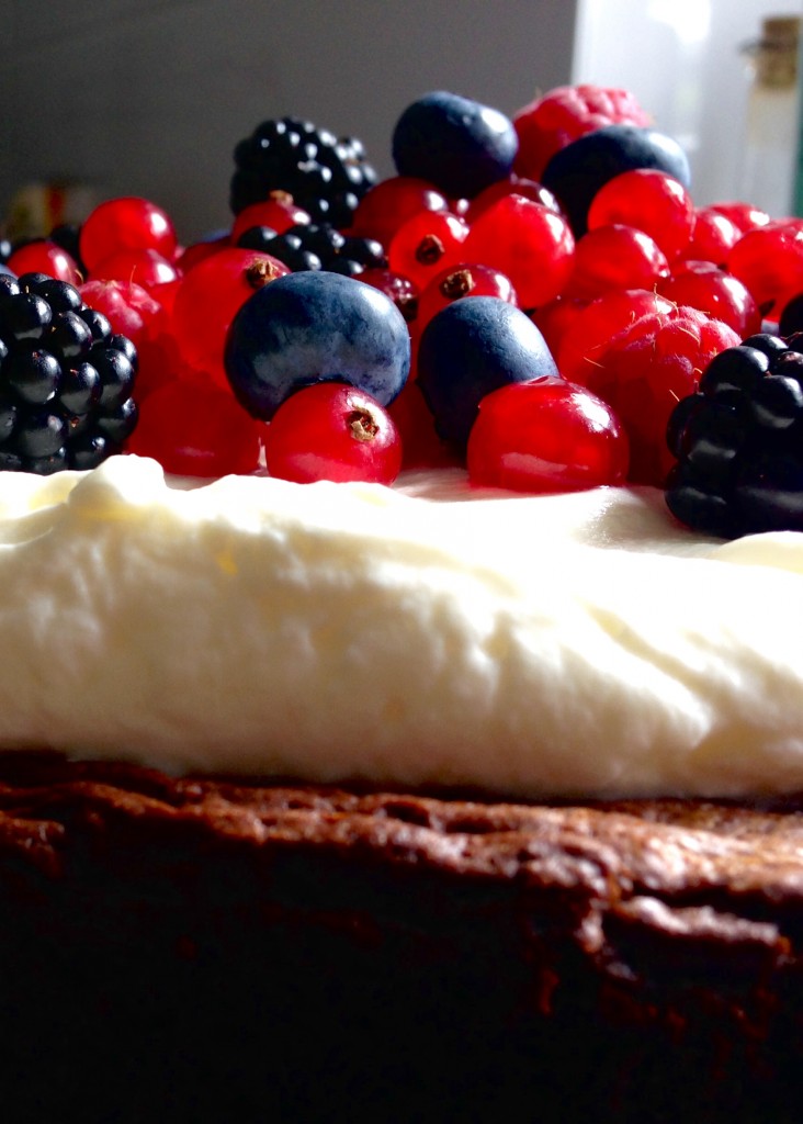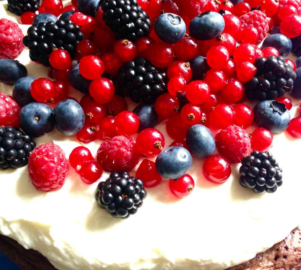 Den Frischkäse mit dem Puderzucker vermengen. Die Sahne steif schlagen. Beides vermischen und auf dem Kuchen verteilen. Anschließend die Früchte auf der Creme verteilen. Es eignen sich Früchte aller Art. Unser Favorit sind Erdbeere oder Blaubeeren. Es ist Zeit zu genießen. Lasst es Euch schmecken…