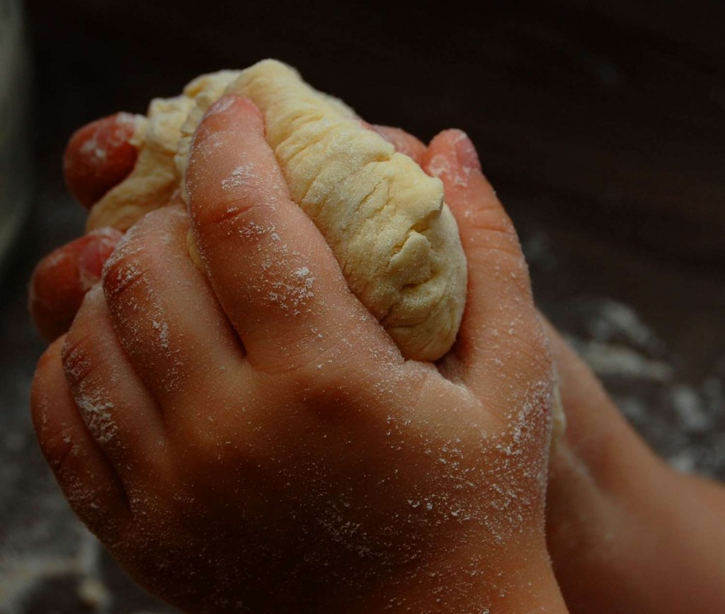 In eine große Schüssel die beiden Mehlsorten sieben. Das Salz die Butter in Flöckchen und das Ei zufügen. Alles grob vermengen bis ein bröseliger Teig entsteht. Nach und nach die Hefemilch dazu geben und alles gut verkneten. Es sollen keine Klümpchen mehr zu sehen und zu spüren sein. Also kneten, kneten, kneten. Den Teig mindestens eine Stunde in Ruhe lassen. Er fühlt sich auch nicht vernachlässigt, wenn er den halben Tag stehen gelassen wird.